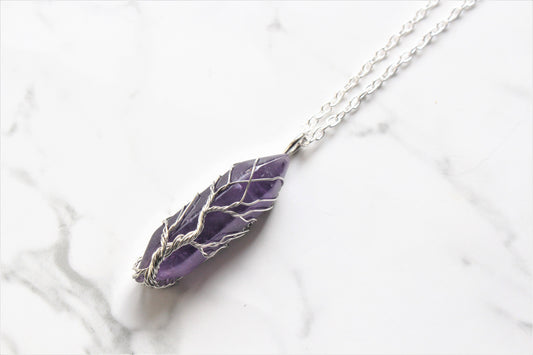 Amethyst / Black Obsidian Wire Wrap Pendant Tree Necklace