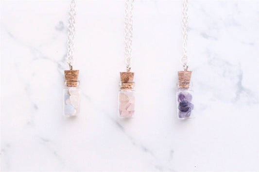 Gemstone Chips Mini Bottle Charm Necklace Opal Rose Quartz Amethyst Crystal Silver Pink Purple Gift for Her UK