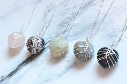 Crystal Heart Pendant Necklace Wire Wrap Necklace Silver Crystal Rock Gift For Her Him Wife Girlfriend Quartz Labradorite Pink Amethyst UK